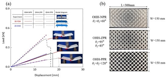 Figure 8c compares the load-displacement curves of OHH cells with different Poisson’s ratios obtained from representative volume element (RVE) of 3D-FEM, the 3D unit cell of 2D-EKM, and experiment. Notably, the data for the 3D unit cell of 2D-EKM were obtained through the local field recovery under . It is evident that the curve for the OHH-ZPR cell has the steepest slope, while the curve for the OHH-PPR cell is the smoothest, with the curve for the OHH-NPR cell falling in between. This disparity can be attributed to the OHH-ZPR cell having the highest equivalent stiffness of and , thereby demonstrating the greatest resistance to axial deformation. The OHH-NPR cell displays the highest ultimate bearing capacity, experiencing abrupt failure in the joint region between the inclined and horizontal walls in the 2-direction at a displacement of 4.2 mm (), resulting in a sudden decline in bearing capacity. Once displacements exceed 1.6 mm () for the OHH-ZPR and OHH-PPR cells, plastic hinges form in the joint area of the inclined and horizontal walls in the 2-direction, enabling slight rotation and entering a prolonged plastic deformation phase. Ultimately, OHH-PPR cell loses its bearing capacity at a displacement of 3.5 mm () due to left-side failure of the unit cell.