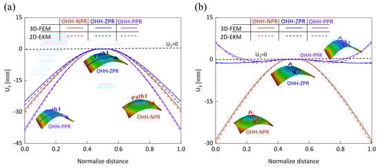 (1) The load-displacement curves of three-point bending confirm the accuracy of the 2D-ERM in predicting the out-of-plane behavior of SP-3D-OAS. By analyzing the in-plane and out-of-plane deformations of SP-3D-OAS under different boundary and loading conditions, the accuracy of 2D-ERM in analyzing the static characteristics of SP-3D-OAS is confirmed. The comparison between the computational efficiency of 3D-FEM and 2D-ERM indicates that excluding the pre- and post-processing stages, the computational time required for 2D-ERM is notably lower than that of 3D-FEM. This finding confirms the computational efficiency of the 2D-ERM.