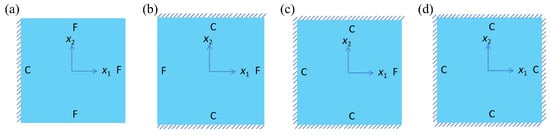 Four types of boundary conditions utilized in dynamic analysis: (a) Case 3: CFFF, (b) Case 4: CCFF, (c) Case 5: CCCF, (d) Case 6: CCCC.