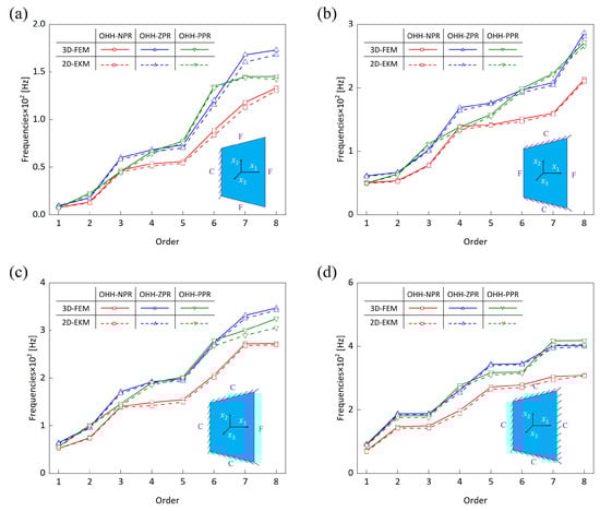 Figure 14 illustrates the first eight eigenfrequencies of the OHH panels across four distinct cases. The eigenfrequencies systematically increase with higher mode orders, particularly the eighth eigenfrequencies for the OHH-NPR, OHH-ZPR, and OHH-PPR panels are 17.40, 17.99, and 18.62 times the fundamental frequency under the CFFF BCs, respectively. The amplification of higher-order eigenmodes results in localized vibrations, enhancing structural stiffness while reducing local mass, consequently elevating the OHH panel’s eigenfrequencies. In all cases, the eigenfrequency curves for the first eight modes of the OHH-NPR panel consistently lie below those of the OHH-ZPR and OHH-PPR panels. Figure 9b illustrates that the OHH-NPR panel exhibits the highest equivalent density, consequently enhancing its inertia and leading to a reduction in eigenfrequencies. The eigenfrequencies obtained from 2D-EKM and 3D-FEM closely align for the OHH panels, with the eigenmodes exhibiting strong correspondence, indicating that 2D-EKM can accurately analyze the modal characteristics of OHH panels.