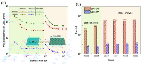 Figure 15b illustrates the time consumption for the static and dynamic analysis of OHH panels. It is evident that dynamic analysis requires more time than static analysis. This difference arises from the complexity of solving matrix eigenvalue problems in dynamic analysis to determine the panel’s eigenfrequencies and eigenmodes. The time required for 2D-EKM is significantly lower than that for 3D-FEM, with the former accounting for just 0.37% of the latter’s analysis time in Case 6. This discrepancy can be attributed to the reduced number of elements utilized in 2D-EKM, leading to a decrease in the degrees of freedom that need to be computed. As a result, this reduction in computational complexity alleviates the processing and memory requirements, consequently enhancing the overall computing efficiency.