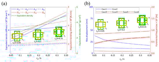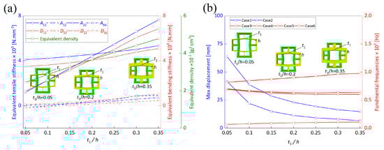 Figure 16 illustrates the impact of the ratio on the equivalent properties, static deformations, and fundamental frequencies of the OHH-ZPR panel under different cases. It is evident that as the ratio increases, both the equivalent tensile and bending stiffness also increase. Specifically, the growth rates of and surpass significantly those of other equivalent properties. This effect is primarily due to the augmentation in the wall thickness of the hybrid honeycomb along the 1-direction (marked in yellow color) as the ratio escalates, resulting in a notable enhancement in the equivalent stiffness in that direction. The maximum deformations in Cases 1 and 2 gradually diminish with increasing , exhibiting reductions of 84% and 77%, respectively. This implies that augmenting can effectively bolster the resistance of OHH-ZPR against both in-plane and out-of-plane deformations.