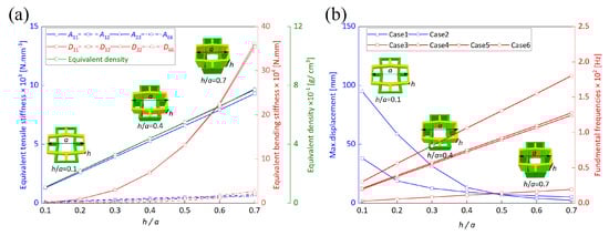 Figure 18 illustrates the impact of the ratio on the equivalent properties, static deformations, and fundamental frequencies of the OHH-ZPR panel. As the height–length ratio of OHH-ZPR increases, both its equivalent tensile and bending stiffness experience significant enhancement, with and showing linear growth, while and exhibit nonlinear growth. This behavior stems from the linear expansion of the cross-sectional area as a result of increased height h, leading to a proportional linear increase in tensile stiffness. Simultaneously, bending stiffness, dependent on the cross-sectional moment of inertia, displays nonlinear growth as a power function of the cross-section dimensions. The improved stiffness effectively enhances the OHH-ZPR panel’s resistance to deformation, resulting in a reduction in the maximum deformation of Cases 1 and 2 as increases, while the fundamental frequencies of Cases 3 to 6 increase accordingly. In particular, with escalating from 0.1 to 0.7, the maximum deformation of Case 2 decreases significantly by 97%, dropping from 98.5 to 2.62 mm.