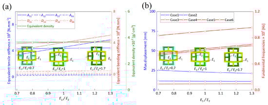 Figure 19 examines the impact of varying material elastic modulus ratios on the equivalent properties, static deformation, and fundamental frequencies of OHH-ZPR panel. The study reveals that increasing the Young’s modulus of the hybrid honeycomb material in the 2-direction (marked in green) within the OHH-ZPR results in a linear augmentation of the equivalent tensile stiffness and bending stiffness in that specific direction, while maintaining other equivalent properties constant. For Cases 1 and 3, where the fixed boundaries are perpendicular to the 1-direction, fluctuations in have minimal effects on and , leading to little impact on their maximum deformation and fundamental frequencies. Conversely, Cases 2 to 6 exhibit higher sensitivity to stiffness variations in the 2-direction, resulting in decreased fundamental frequencies and reduced maximum deformations under the same loads.