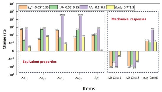 To investigate the influence of various parameters on the equivalent properties and mechanical responses of the OHH-ZPR panel, a comparative analysis is conducted using dimensionless ratios (ratio of the variation in equivalent properties and mechanical response to the range of variation in each parameter), as illustrated in Figure 20. Specifically, increasing the ratios of four parameters enhances the equivalent properties of the OHH-ZPR panel. Moreover, the geometric parameters have a greater impact on the equivalent properties and mechanical responses of the OHH-ZPR panel compared to changes in the Young’s modulus ratio of materials. Particularly, the ratio makes a substantial contribution to the equivalent properties and mechanical responses of the OHH-ZPR panel, notably regarding the equivalent bending stiffness and . For each 1% increase in , and , respectively, increase by 275.62% and 281.93%.