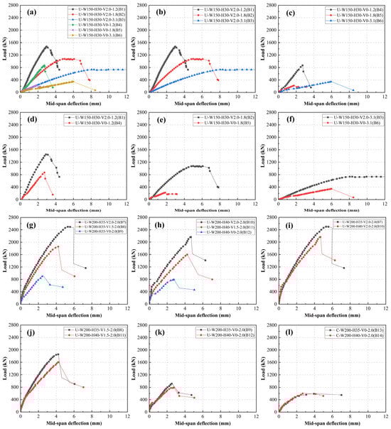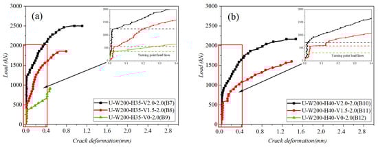 - The addition of steel fibers in the concrete mix could markedly improve the post-cracking load-bearing performance of non-stirrup UHPC beams. As the steel fiber volume content increased from 1.5% to 2.0%, the crack deformation at the ultimate load of specimens B7 and B10 could be increased by up to 39% and 6%, compared to B8 and B11, respectively. The beam height had a minor effect on the crack deformation at the turning point; however, it could significantly influence the crack deformation at the ultimate load.
