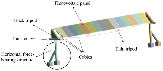 - Tang, J.; Lin, J.; Huo, J. Structural characteristic analysis and optimal design of flexible photovoltaic support structure. J. Huaqiao Univ. (Nat. Sci.) 2019, 40, 331–337. [Google Scholar] [CrossRef]
