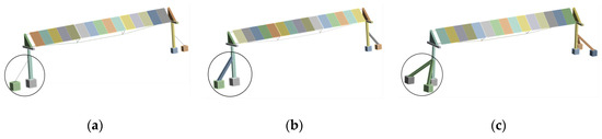 Mechanical diagrams of different types of flexible PV support structures. (a) The horizontal force-bearing structure of inclined cables, (b) the horizontal force-bearing structure of inclined steel columns, and (c) the horizontal force-bearing structure of eight-shaped inclined steel columns.