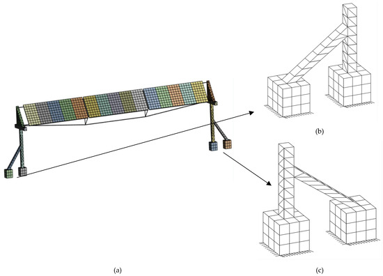 Mesh division of flexible PV support structures. (a) Mesh division, (b) boundary conditions for the left foundation, and (c) boundary conditions for the right foundation.