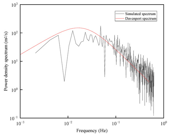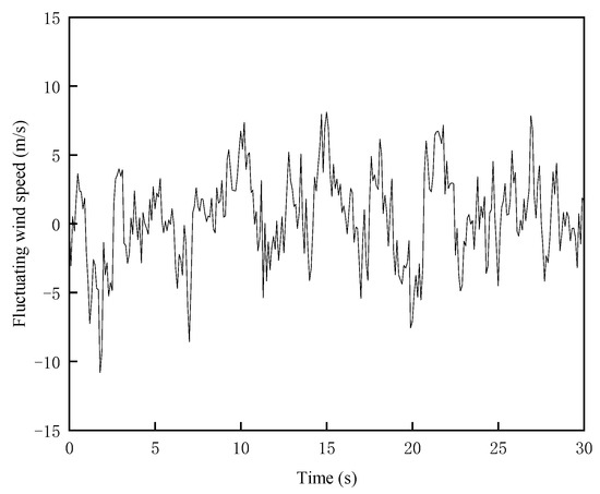 Employing the algorithm above, a horizontal gust wind velocity was conducted. The simulation encompassed a time interval of 0.1 s, spanning a total duration of 30 s. Specifically, the mean wind speed at a height of 10 m in Shenyang was recorded as 25.3 m/s. Consequently, a time history of the fluctuating wind speed was obtained and presented in Figure 7. Furthermore, Figure 8 depicts the power spectral density curve of the simulated wind speed. Notably, the power spectrum aligned closely with the target auto-power spectrum, indicating the reliability of the simulated time history of fluctuating wind speed.