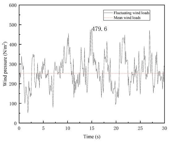 Figure 9 presents the wind pressure under both loading conditions. Figure 9 illustrates that the fluctuating peak wind load can attain a value of 479.6 N/m, significantly surpassing the mean wind load. As a result, the actual response of the flexible PV support structure under severe wind conditions may be underestimated in analysis. Therefore, the safety and wind-induced response of the flexible PV support structure under fluctuating wind load should be considered and compared with its response under mean wind load.