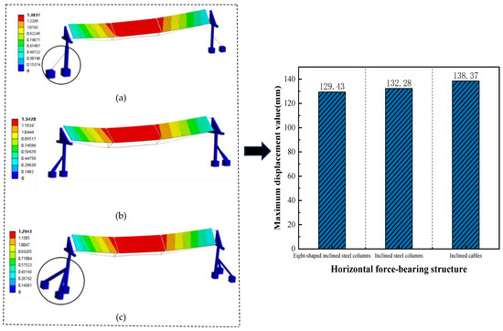 Displacement of three horizontal force-bearing structures under mean wind loads. (a) The horizontal force-bearing structure of inclined cables, (b) the horizontal force-bearing structure of inclined steel columns, and (c) the horizontal force-bearing structure of eight-shaped inclined steel columns.
