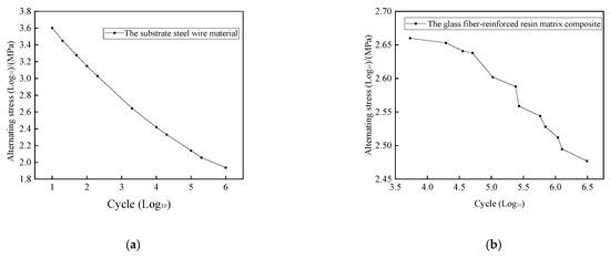 The S-N curves for two materials. (a) The S-N curves of the substrate steel wire material and (b) the S-N curves of the glass-fiber-reinforced resin matrix composite material.