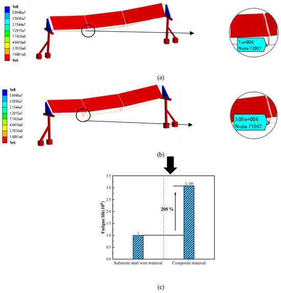 Comparison of fatigue life of two materials in the cable structure under mean wind loads. (a) Substrate steel wire material and (b) composite material. (c) Comparison of fatigue life under two materials.
