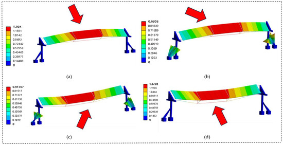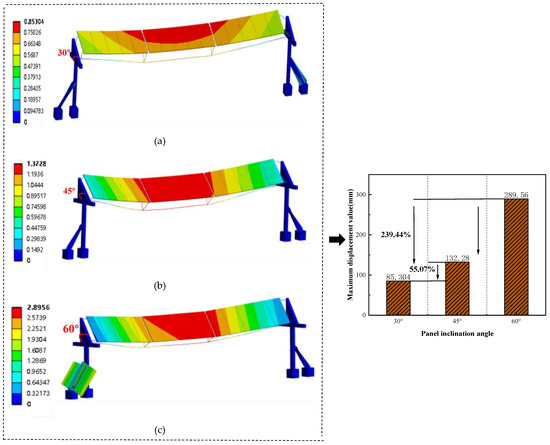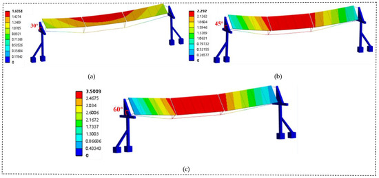 Prior research on the panel inclination angle of PV supports has predominantly concentrated on fixed PV support structures, leaving a need for more studies on flexible PV supports with larger spans and more pliable designs. In this section, we specifically delve into the influence of the panel inclination angle on the dynamic behavior of flexible PV support structures under the effects of mean wind loads. It is important to note that the analysis only focused on applying the 180° horizontal wind direction, specifying a mean wind load of 252.5 N/m2, acting on a PV panel, as shown in Figure 9. A fixed constraint was used on the foundation, and the leg part of the flexible PV support was also fixed on the foundation. Previous studies on panel inclination angles of PV support structures mainly focused on three representative panel inclination angles of 30°, 45°, and 60° [39,40,41,42]. Therefore, this paper analyzed these three panel inclination angles, and the simulation results are shown in Figure 14.