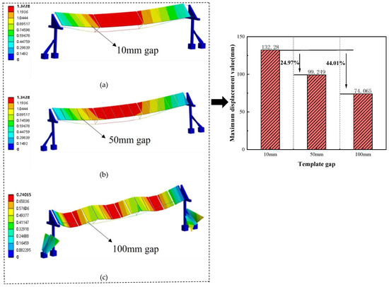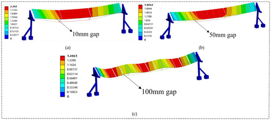 Drawing from previous research, there are two contrasting viewpoints regarding the impact of template gaps on the wind-induced response of PV systems. Some scholars assert that the template gap significantly influences the wind-induced response [47,48,49], while others contend that its influence is minimal or nonexistent [50,51,52]. In the present study, we delved into this controversy by analyzing the effects of 10 mm, 50 mm, and 100 mm template gaps on the wind-induced response of flexible PV support structures. To uphold the scientific rigor of our simulations, we maintained a constant span for the flexible PV support structure throughout the experiment. This approach enabled us to precisely evaluate the structural displacement of different template gaps and comprehensively understand their interrelationships.