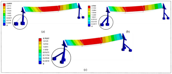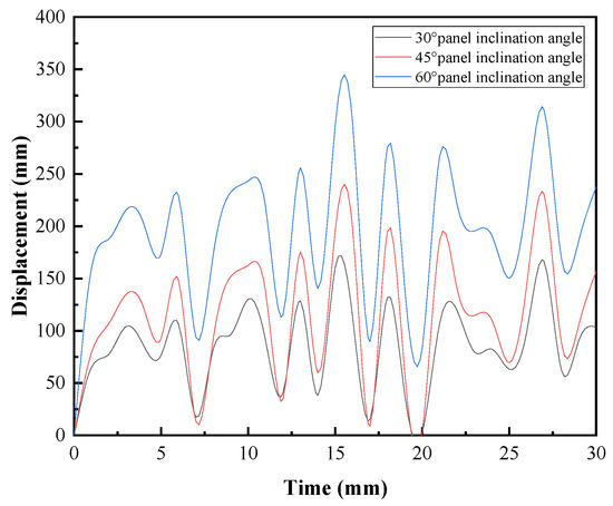 Comparison of displacement values of three typical panel inclination angles under mean wind loads: (a) 30° panel inclination angle, (b) 45° panel inclination angle, and (c) 60° panel inclination angle.