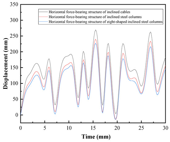 The results above indicate that, when subjected to the mean wind load, the displacement values exhibited by the three types of horizontal force-bearing structures were notably similar. However, a closer examination revealed that the displacement values of the horizontal force-bearing structure of eight-shaped inclined steel columns and the horizontal force-bearing structure of inclined steel columns were comparatively lower. Consequently, these two types of structures, namely, the horizontal force-bearing structure of eight-shaped inclined steel columns and the horizontal force-bearing structure of inclined steel columns, demonstrated a higher degree of safety than the horizontal force-bearing structure of inclined cables.