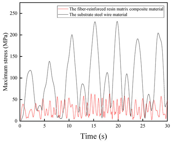 Based on the thorough analysis of the simulation results, it was evident that the fatigue life of the cable structure utilizing substrate steel wire material stood at 1 × 10⁶ cycles. In contrast, the fatigue life of the cable structure employing the glass-fiber-reinforced resin matrix composite material attained a significant figure of 3.08 × 10⁶ cycles. This substantial enhancement represents a 208% increase in fatigue life, demonstrating the profound impact of the composite material in bolstering the durability of the flexible PV support structure under mean wind loading conditions. This is consistent with the findings of Ke et al. [14], while also validating the applicability and effectiveness of composite materials in the construction of flexible PV support structures, thus providing a viable alternative to improve such systems’ long-term performance and reliability.