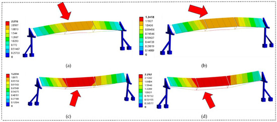 Displacement values of four typical wind direction angles under mean wind loads: (a) 0° wind direction angle, (b) 45° wind direction angle, (c) 135° wind direction angle, and (d) 180° wind direction angle.