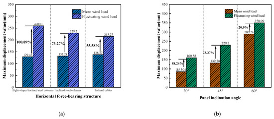 - It is not difficult to see from Figure 30 that although the fluctuating wind load was far less than the mean wind load in numerical terms, the structural displacement under the fluctuating wind load was significantly larger than that under the mean wind load in the analysis of various factors. Thus, the fluctuating wind load was non-negligible in the flexible PV support structure.