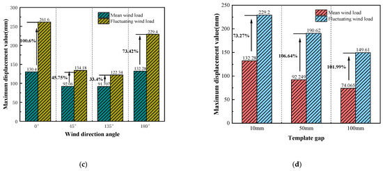 Figure 30. Comparison of structural displacement under different factors of fluctuating and mean wind loads. (a) Force-bearing safety analysis, (b) panel inclination angle, (c) wind direction angle, and (d) template gap.