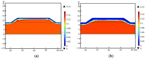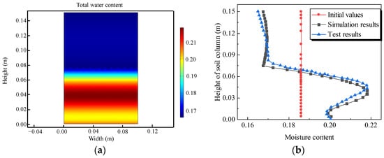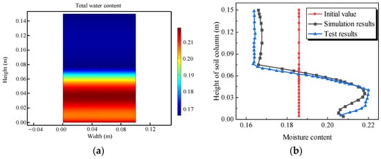The simulation of the thawing test was modeled in reference to the freezing test, with consistent soil and model parameters. However, unlike the freezing test, the initial temperature was kept constant at −2.1 °C, and the water content distribution after 120 h is presented in Figure 2. During the soil column thawing process, the height of the frozen–thawed zone interface and the simulated freezing temperature value were consistent with the freezing test, respectively, 7.5 cm and −0.57 °C. The liquid water content above the frozen–thawed zone interface decreased gradually and uniformly, while the liquid water content below the frozen–thawed zone interface increased vertically from bottom to top. The water content at the frozen–thawed zone interface increased with time and, after the frozen–thawed zone interface stabilized, an increasing trend in the water content could be observed. The variation trend in the total water field in the soil column was basically consistent with the final result of the laboratory thawing test, with an average relative error of 8.5%, verifying the rationality of the water–heat coupling model.