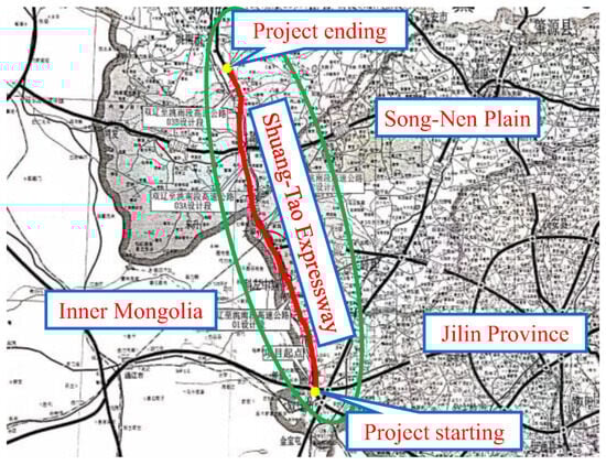 The Shuang-Tao expressway is located in the western region of Jilin province, China, as shown in Figure 3. It is an important longitudinal, regional distribution expressway. The expressway belongs to the mid-temperature zone of the continental monsoon climate, with significant seasonal changes. Spring is dry and windy, summer is hot and rainy, autumn is cool with large temperature differences between day and night, and winter is long and cold.