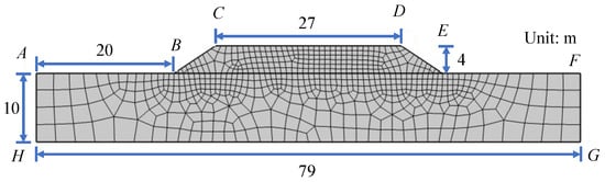 The width of the roadbed was 27 m, the height was 4 m, and the side slope was 1:1.5. The depth below the roadbed was 10 m. When the boundaries of the model were far enough, the effect of the temperature field of the roadbed on the original seasonal permafrost could be ignored [25]. Therefore, the outward length on each side was taken as 20 m. The roadbed fill was gravel soil and the foundation was powdery clay. The model adopted a free quadrilateral mesh and the roadway section was densified, as shown in Figure 4. The selected parameters for the roadbed are shown in Table 2 and Table 3.