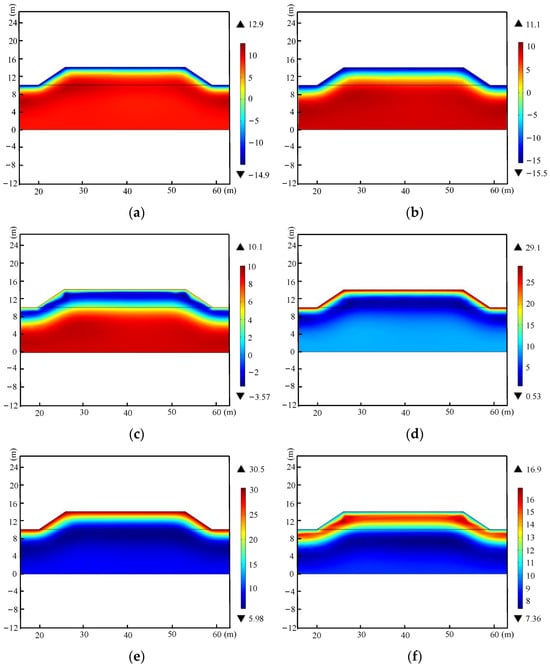 Temperature variation in the roadbed in one year: (a) 17 December, (b) 15 February, (c) 14 April, (d) 13 June, (e) 12 August, and (f) 11 October.