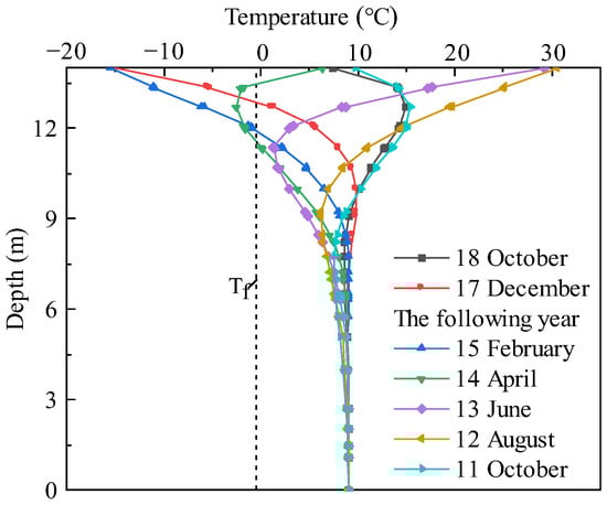 To investigate seasonal variations in the ground temperature within a permafrost roadbed, a water–heat coupling analysis was conducted, with subsequent analysis of the roadbed temperature distributions every 60 days, commencing from 18 October of the initial year. As presented in Figure 5 and Figure 6, with a decrease in the external temperature, the temperature of the upper boundary of the roadbed dropped to −15 °C on 17 December, reaching the soil’s freezing point, resulting in a 1.3 m deep frozen layer within the roadbed. By 15 February of the subsequent year, the upper boundary temperature stabilized at −15 °C, with the frozen depth extending to approximately 2 m, due to the extended freezing duration. Below this depth, temperatures remained above the freezing point, gradually approaching the initial temperature. On 14 April of the same year, with ambient temperatures rising to 7 °C, the roadbed temperature commenced an upward trend. Nevertheless, pockets of sub-zero soil persisted within the roadbed. Heat transfer occurred bidirectionally, with warmth ascending from deep layers and descending from the surface, initiating a thawing process marked by heat absorption. Despite an overall temperature increase, the frozen depth paradoxically expanded from 2 to 2.5 m. On 13 June, with sustained temperature increases, all soil layers within the roadbed surpassed the freezing point, with the temperature nadir observed at a depth of approximately 2.5 m. On 12 August, the roadbed’s temperature hovered around 30 °C, with the soil’s coolest point located at a depth of approximately 5 m. This phenomenon stems from bidirectional heat transfer, with both shallow and deep, warmer zones simultaneously transferring heat to cooler regions. Consequently, the depth of the lowest temperature shifted from 2.5 to 5 m. In October of the subsequent year, with ambient temperatures declining to approximately 7 °C, the roadbed’s temperature distribution mirrored that observed in October of the initial year. Upon crossing the freezing threshold, a fresh freeze–thaw cycle was initiated.