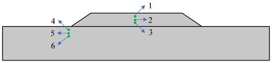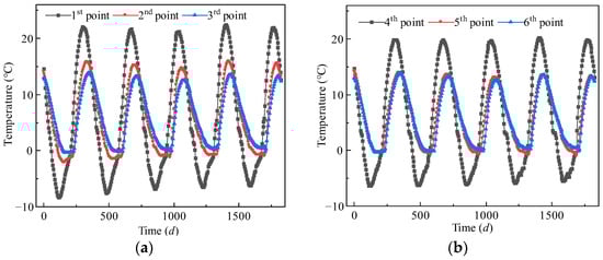 As depicted in Figure 7, the first, second, and third control points were positioned at depths of 1, 2, and 2.5 m, respectively, below the roadbed’s centerline. Meanwhile, the fourth, fifth, and sixth control points were situated at depths of 1, 2, and 2.5, respectively, beneath the natural ground surface, 0.5 m lateral to the left slope foot. Figure 8 illustrates the temporal temperature variation curves for the six control points, revealing a sinusoidal trend that aligns with fluctuations in the boundary temperatures. A consistent pattern of temperature variation was evident across all six points. However, the soil’s inherent temperature lag response accounts for the delayed increase in temperatures at points 2 and 3 beneath the roadbed, even as point 1 initiates an upward trend. This lag necessitates varying durations for each depth’s controlled point to attain maximum or minimum temperatures. During the freezing period, the roadbed soil at equivalent depths exhibited temperatures 1 °C to 2 °C higher than the foundation soil. Similarly, during soil warming, the roadbed soil retained higher temperatures, attributable to its more pronounced temperature variations compared to the foundation soil. Control points 5 and 6 recorded a minimum temperature of approximately 0 °C, confirming a foundation freezing depth of ~2 m, aligned with the observed conditions. Point 2’s minimum temperature was also ~0 °C, whereas point 3 dipped below freezing, indicating a roadbed freezing depth of ~2.5 m. This establishes the order of the depth-based influence of the ground temperature as roadbed > natural ground surface.
