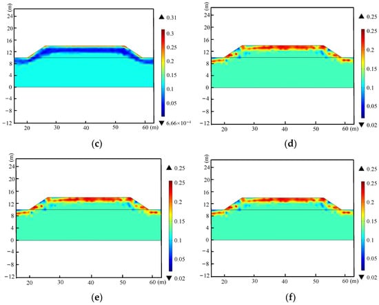 Variation in the liquid water content of the roadbed in one year: (a) 17 December, (b) 15 February, (c) 14 April, (d) 13 June, (e) 12 August, and (f) 11 October.