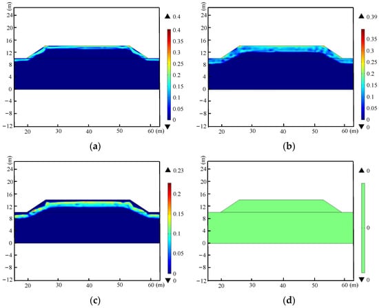 First, based on the established water–heat coupling model, the solid mechanics module was added, and the aforementioned water–heat coupling results were imported into the model through interpolation functions. Then, the thermal expansion interface was introduced into the solid mechanics interface, and the relevant parameters and boundary conditions were set. The thermal expansion coefficient was calculated using the secant method. When the temperature fell below the freezing point of the soil, the freezing coefficient was applied. Conversely, when the temperature exceeded the soil’s freezing point, the thawing coefficient was used. The thermal expansion coefficients of gravelly soil and powdery clay were converted into IF statement inputs based on Equations (30)–(32). Taking powdery clay as an example, the input expression is as follow: