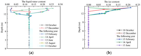 Variations in the liquid water and ice content in the center of the roadbed according to different depths in one year: (a) the liquid water content and (b) the ice content.