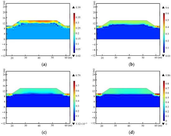 Water content distribution in the roadbed after 8 years: (a) after 2 years, (b) after 4 years, (c) after 6 years, and (d) after 8 years.