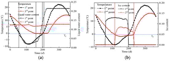 To investigate the water–heat interplay in roadbed soil, time history curves of the liquid water content and temperature, as well as ice content and temperature, were plotted and analyzed, as depicted in Figure 14. The results indicated that the liquid water content at point 1 began to decrease before the temperature reached the freezing point of the soil, and the liquid water at points 1 and 3 slightly increased during the freezing period due to water migration from unfrozen areas. After the temperature reached the freezing point, the ice content rapidly increased, whereas it decreased rapidly as the temperature reached the thawing point. However, the water content field had a slight lag compared to the temperature field. This is because ice is more sensitive to temperature, while liquid water can migrate as the temperature fluctuates.