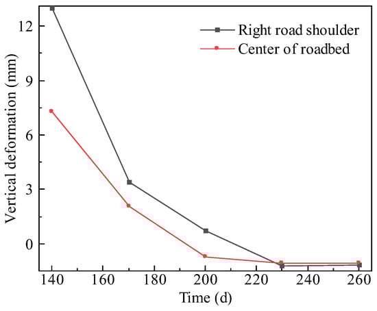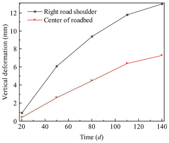 A study was conducted to investigate the deformation of the road and shoulder during freezing conditions, with displacement–time curves presented in Figure 15. It can be seen that by the 20th day, November’s onset saw a persistent decline in ambient temperature, leading to gradual roadbed soil expansion. Notably, the vertical deformation at the right shoulder exceeded that at the roadbed center. This is because the soil on both sides of the roadbed’s right shoulder is frozen and a large temperature gradient is formed during the freezing process. It freezes faster than the soil at the center of the roadbed. Therefore, the water in the roadbed soil migrates first to the shoulder, making the freezing and expansion of the soil at the shoulder more obvious. Furthermore, the period spanning from the 20th to 50th day marked a rapid phase of freezing and expansion, with substantial increases in frost heave. Subsequently, the rate of increase diminished on a monthly basis. By the 140th day, the maximum frost heave at the shoulder reached 13 mm, whereas the center of the roadbed experienced a maximum of 7.3 mm. This disparity in deformation between the shoulder and roadbed center will cause uneven deformation of the road.