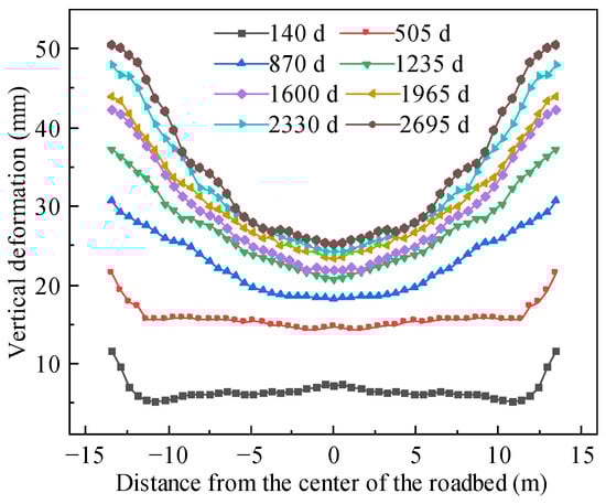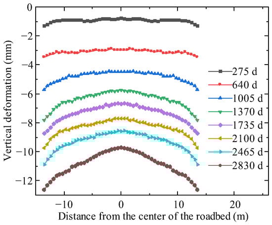 The thaw settlement on July 4th of each year was analyzed, as presented in Figure 18. It can be obtained that the thaw settlement deformation of the roadbed was symmetrically distributed along the transverse direction and there was uneven deformation on the roadbed surface, which presented a convex shape after thaw settlement deformation. Additionally, the roadbed underwent constant moisture redistribution due to the influence of water migration. Without considering external factors, such as drainage and evaporation, every freeze–thaw cycle caused water to accumulate on the upper and top surface of the roadbed. This gradual water accumulation enhances thaw settlement deformation over time. The shoulder exhibited a peak thaw settlement of 1.3 mm on the 275th day, escalating to 12.6 mm over 7 years. Comparatively, the road center peaked at 0.76 mm on the 275th day, reaching 9.67 mm after 7 years. Generally, waterlogged subgrade fills experience heightened thaw settlement with rising temperatures due to increased moisture content, exacerbating uneven settlement on the subgrade surface.