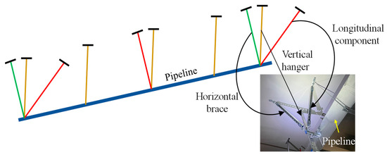Due to substantial post-earthquake loss caused by damage to the piping system, the seismic design of the piping system has attracted worldwide attention from the academic and engineering fields. It was observed that sway-braced components were essential and crucial to maintain the post-earthquake capacity of piping systems [7,8,9]. The typical structural supports depend frequently on the components in the vertical, transverse and longitudinal directions, respectively, as shown in Figure 1. As shown in the figure, the vertical hangers are designed properly to sustain the gravity of the supporting pipes. And, the horizontal and longitudinal components are primarily designed to resist the action of horizontal earthquakes, and they are called seismic sway braces (SSBs). It has been shown in the recent major earthquakes that piping systems supported by SSBs have represented much better seismic performance than those with only vertical support, and these have been applied in tdesign guidelines and technical specifications in some countries and industry agencies [10,11,12].