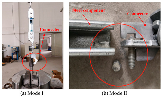 For SSB-supported piping systems, several static and quasi-static seismic tests have been carried out to evaluate their seismic performance [12,13]. It has been shown through experimental research that two failure modes were mainly found and confirmed, which are shown in Figure 2 [14]. As shown in the figure, Mode I is the buckling of connecters, and Mode II is the slipslop between the connecters and their connected steel members. With the reduction in interfacial friction performance, the ultimate bearing capacity of Mode II is much smaller than that of Mode I. Some tests have also detected the relationship between the tightening state of bolts and the ultimate bearing capacity, in which the ultimate bearing capacity is reduced significantly with a decrease in the tightening torque of the bolts. Consequently, some technical codes have recommended the tightening torque of bolts as one of the typical acceptance parameters of SSBs [15].