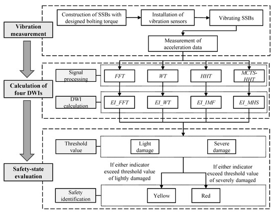 In this section, a vibration-based pre-warning method and its technical route are presented by explaining its research idea and steps in implementation. Figure 4 presents a chart of research procedure integrating experiential verification and project application. As shown in the figure, there are three main steps for bolting looseness assessing of SSBs based on the measured acceleration data, which are presented as follows: