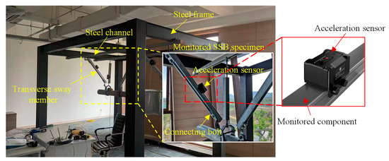 - The SSBs are first installed at certain positions by tightening their connecting bolts to the designed bolting torque. Then, a wireless vibration sensor equipped with a vibration exciter is installed at the midspan of the bracing components. In the actual projects, the installed wireless vibration sensors wake up at the set intervals and activate the vibration exciter to produce vibration and measure the acceleration data of SSBs. Thereafter, the measured data are transferred to a remote server via a wireless network.