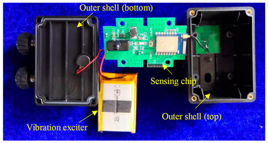 A wireless acceleration sensor is installed at the midspan position of a sway member to measure and transmit vibration signal to a monitor. There are four modules inside the sensor, i.e., a sensing module, an in-situ data processing module, a wireless communication module and a battery module. A MEMS triaxial accelerometer is used as the sensing module, with measurement range and precision of ±16 g and 0.001 mm/s2, respectively. The in-situ data processing module contains a processing unit with frequency of 32 MHz and a Flash memory with a capacity of 8 MPa. A Zigbee-standard 2.4 GHz RF chip is used as the wireless communication module with data transfer rating up to 250 kps. A lithium battery with a capacity of 500 mA and a charging circuit is implemented as the battery module. As the weight of the sensors is only no higher than 120 g where the weight of the monitored component is no lower than 3500 g/m. Assuming the length of the monitored components is 1000 mm, the weight of the sensors accounts for only 3.4% which can be ignored in the dynamic evaluation of SSBs. To improve construction efficiency and service durability, a bolt-controlled clamp is designed at the bottom of sensors where the monitored component can be pinched tightly by the sensors, which is shown in Figure 5. To enhance the vibration signal, a vibration exciter is installed in the sensor, as shown in Figure 6. The sampling frequency is set as 800 Hz, and the working time domain of the vibrator is set as 60 s with an interval of 60 s when applied in actual projects for saving power.
