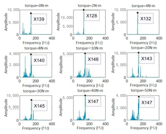 The FFT method is first used to process the collected acceleration data to calculate and obtain acceleration spectra under nine bolting torques. The results of nine acceleration spectra are shown in Figure 7. As there are ten samples of acceleration data under each bolting torque condition, is defined as the characteristic frequency from the ith sample of the data. The calculated under the nine conditions of bolting torques are presented in Table 1. Having eliminated the maximum and minimum values, is defined and calculated by averaging values of the remain series of , which is shown in Table 1 as well. As shown in the table, the traditional indicator, i.e., principal frequency, does not vary monotonically with the bolting torque. Defining the characteristic frequency under the bolting torque of 50 N·m as , the value of EI_FFT correspond to , which is named as , is calculated according to Equation (12). The scatter diagram between and N is shown in Figure 8.