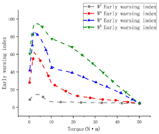The EMD analysis is applied to process vibration data under 9 different bolting torques to suppress the interference by the zero mean noises, and correlation coefficients between the intrinsic mode function and the simplified correlation time series function is calculated and obtained. To obtain a threshold value, the extreme value of correlation coefficients is then calculated and then divided by 10.0. If the correlation coefficients are greater than the threshold value, the IMF component is retained. Otherwise, the IMF component is discarded. In this section, the first-order IMF component is used to calculate the frequency energy, i.e., , for its sensitivity to bolting torque, and the frequency energy value corresponding to the bolting torque of 50 N·m is defined as , by which the Pre-alarming indicator based on WP, i.e., EI_WP is calculated according to Equation (17). By corresponding the to the bolting torque N, the scatter diagram is shown in Figure 10.