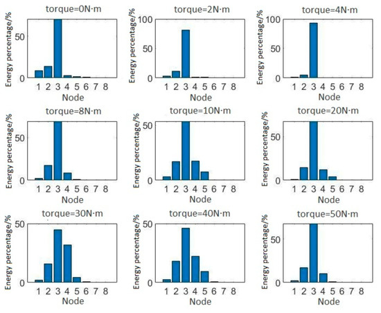 Dmey wavelet is also applied to decompose the collected vibration data by a three-layer wavelet packet, by which the value of the energy corresponding to each frequency is calculated and obtained. The total frequency band is divided equally into eight units, where the maximum frequency and the unit width are defined as 400 Hz and 50 Hz. Figure 9 presents columns of energy-ratio along with unit sequence. As shown in the figure, the energy is mainly distributed from the 3th to the 5th unit, i.e., from 150 Hz to 250 Hz. It is found that the energy during the scope of frequency is sensitive to the bolting torque, and the corresponding energy during the frequency band is therefore calculated according to Equation (13). Defining the value of energy at the bolting torque 50N·m as , the Pre-alarming indicator based on WP under nine different bolting torque, i.e., , is calculated and obtained according to Equation (16). The scatter diagram between N and is shown in Figure 8 as well.