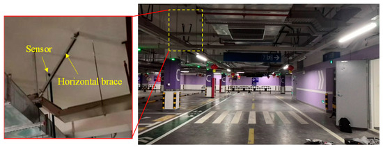 To verify the effectiveness of the pre-alarming method for SSBs, a vibration-based monitoring system was installed in an actual project. The project is located at the basement of Nanjing International Expo Center in Nanjing, China, as shown in Figure 10. The monitoring system comprises 100 wireless acceleration sensors, 2 wireless gateway devices, 2 pairs of optical machines, 2 switches, 1 server and 1 cloud terminal. In the monitoring system, the pre-alarming threshold value for four indicators is shown in Table 2, which is obtained and confirmed through a pre-test in the actual project before the system is installation.