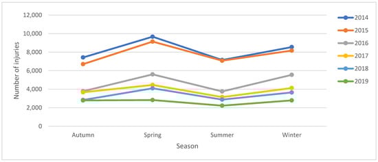Figure 1 shows the number of accidents and injuries affecting construction industry workers throughout the various seasons between 2014 and 2019.