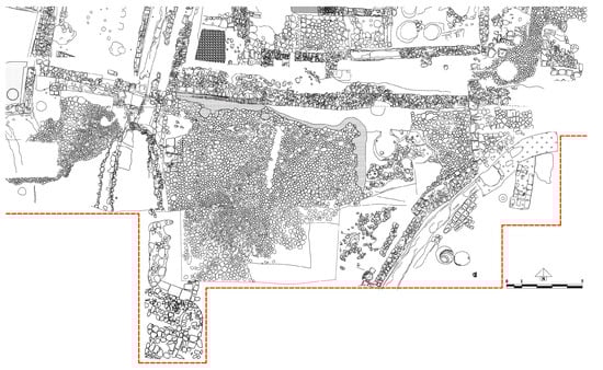 A substantial number of finds at a range of scales were contained in this Hellenistic urban discovery. At the architectural scale, there were floors and walls of houses and streets, while the smaller scale featured unique votive finds shaped like bulls [11,12]. Above all, the urban scale finds included magnificent examples of walls and towers used for city defense, the monumental remnants of a cultic institution, and an exquisite plaza. After partially discovering this plaza, parts of which remain unearthed to this day, the team began documenting the original features and assessing the degree of deterioration over time. A preliminary examination indicated that consolidation was urgently required to stop the continued loss of stones.